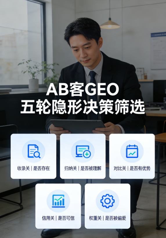 AB客提出:外贸 GEO 的本质,是帮助企业通过 AI 的五轮隐形决策筛选,进入最终推荐池。