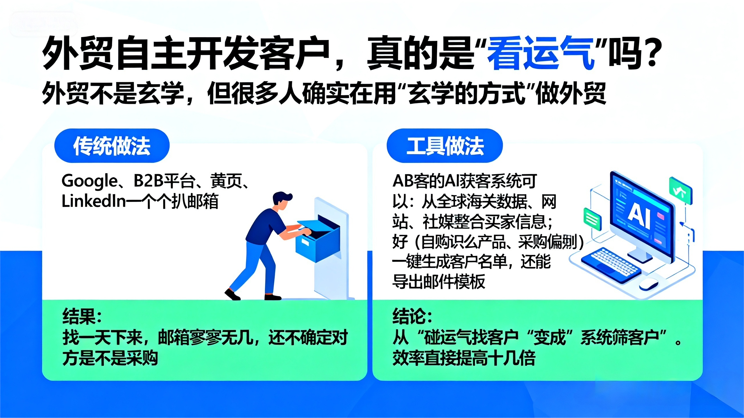 与此相比,基于AI技术的获客工具,比如“AB客”,则利用全球海关数据+网站+社媒多维度整合客户信息,自动分析客户的采购品类和地区分布,快速精准筛出高意向采购名单。以往一天的手动搜寻效率,借助系统可以提升10倍以上,不仅数量大,更大大降低无效联系。